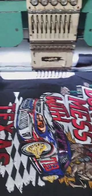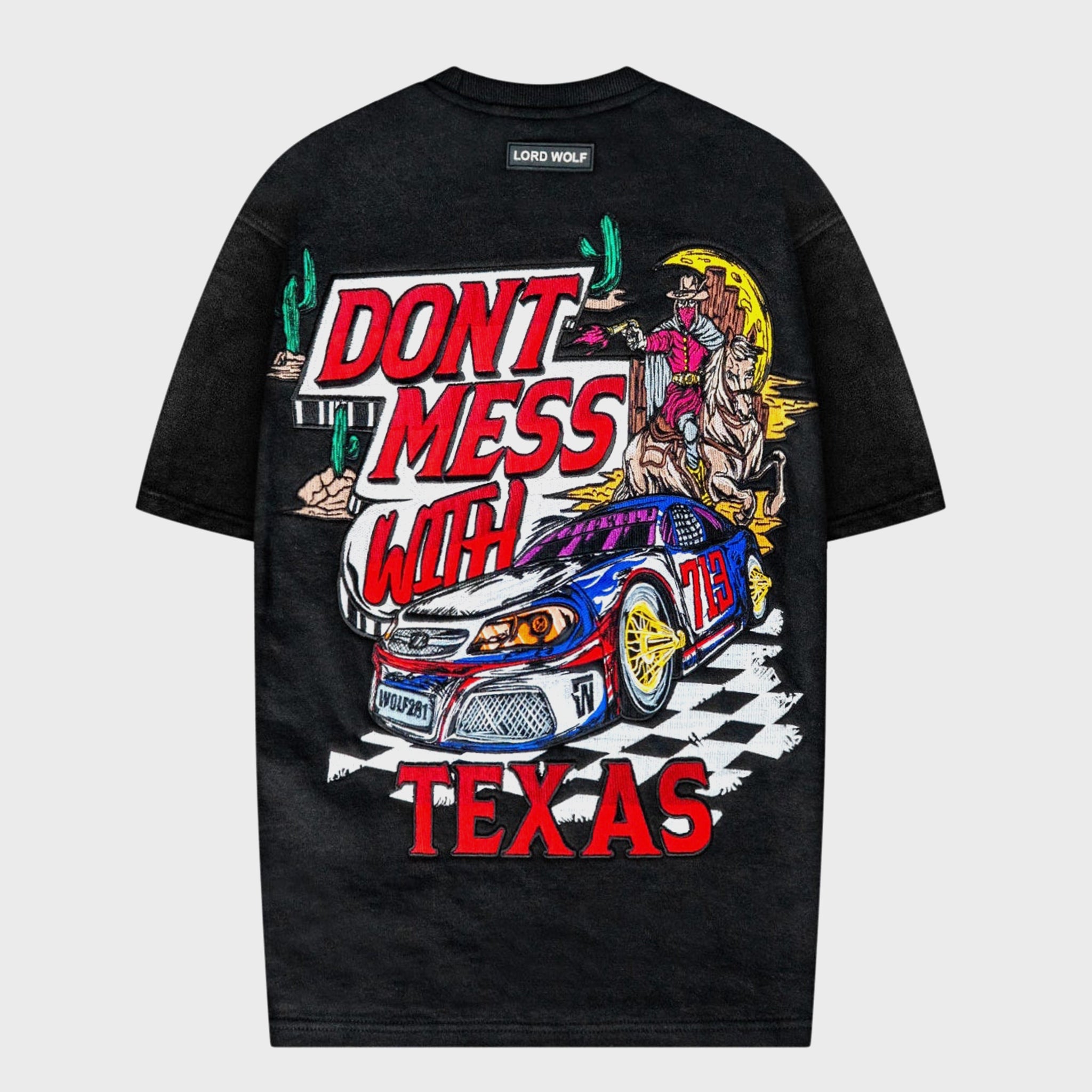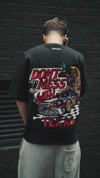 With a cowboy on horseback, a racing car, and oversized lettering, the Don’t Mess With Texas Tee delivers bold back embroidery balanced by a detailed front chest design.