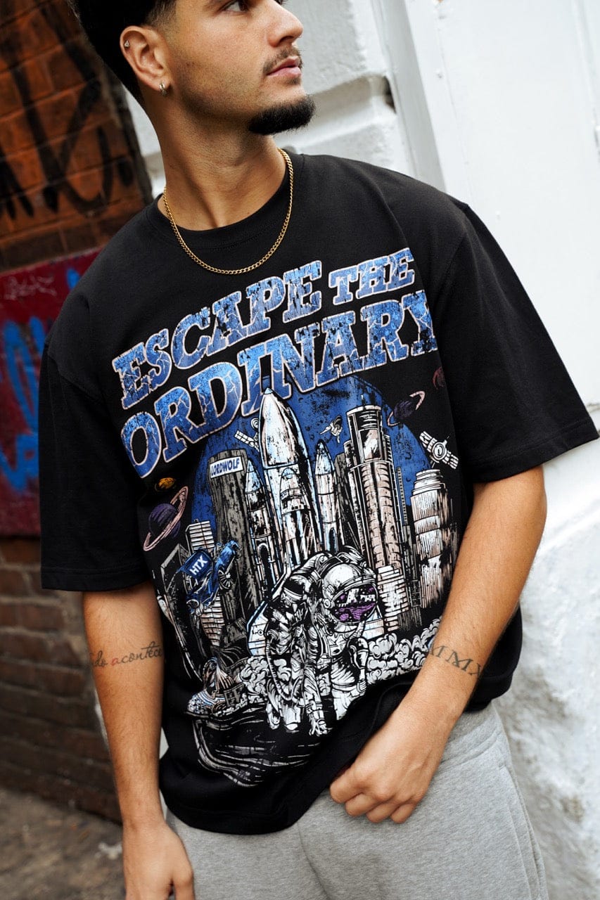 Cut from 100% organic cotton jersey, the Escape Tee pairs a relaxed crew-neck fit with a bold astronaut graphic set against a futuristic Houston skyline. A limited-edition piece, produced in-house and true to Lord Wolf’s mantra: Escape the Ordinary.