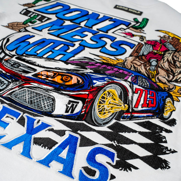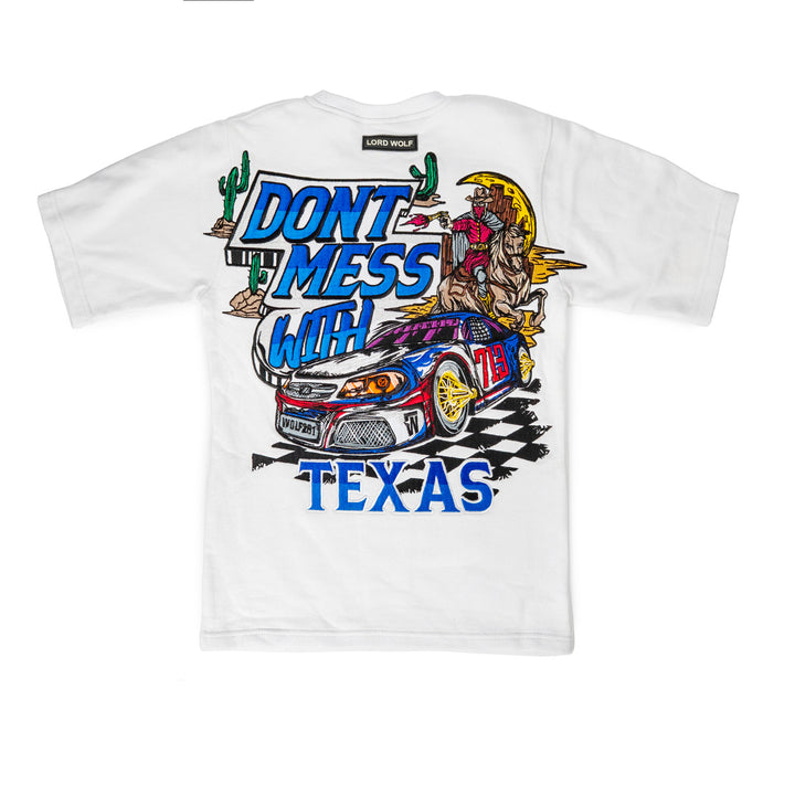 With a cowboy on horseback, a racing car, and oversized lettering, the Don’t Mess With Texas Tee delivers bold back embroidery balanced by a detailed front chest design.