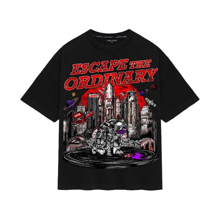 Cut from 100% organic cotton jersey, the Escape Tee pairs a relaxed crew-neck fit with a bold astronaut graphic set against a futuristic Houston skyline. A limited-edition piece, produced in-house and true to Lord Wolf’s mantra: Escape the Ordinary.