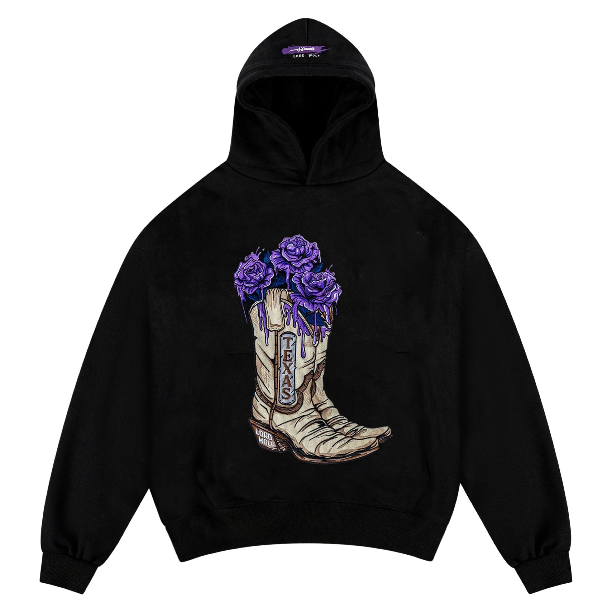 Design: The Boot Hoodie features a Texas boot with dripping purple roses, reimagining a Texas icon into a bold statement piece.